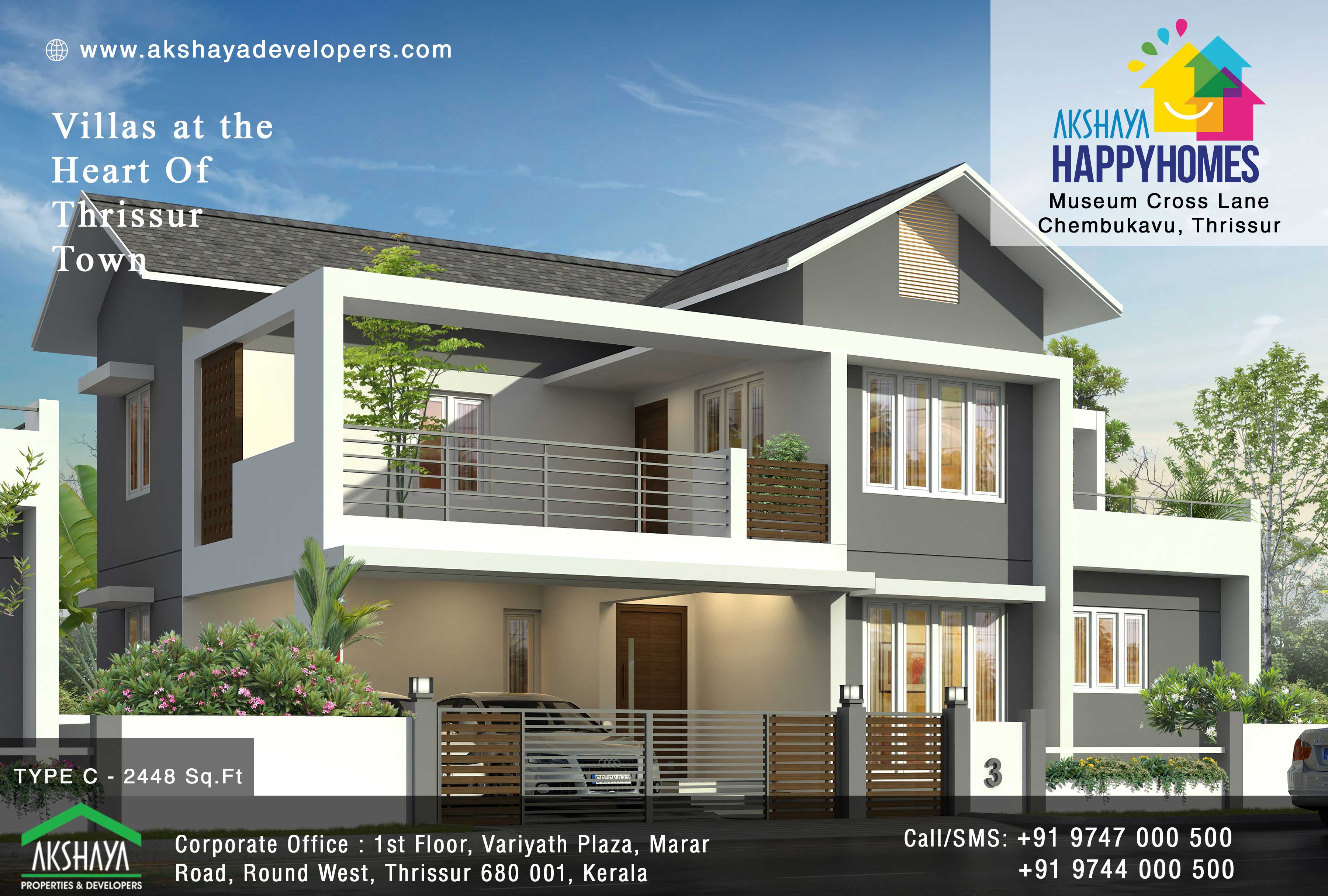 It is a dream of every Malayalees to own a premium villas in thrissur in the cultural capital of kerala,Akshaya Properties and Developers provides 3 bhk and 4 bhk premium gated community villas in thrissur for sale with excellent features.Akshaya Builders Luxury villas in thrissur Project includes,Gated community with main Entrance gate,Paved driveway with street lighting,Multipurpose recreation hall,Shuttle court,Game room,Gym,CCTV for common area,Intercom facilities. This make our ready to Occupy Villas in Thrissur project, one of the best villa projects in Kerala.All theseready to live Villas in Thrissur is located only 1 Km from Swaraj round.