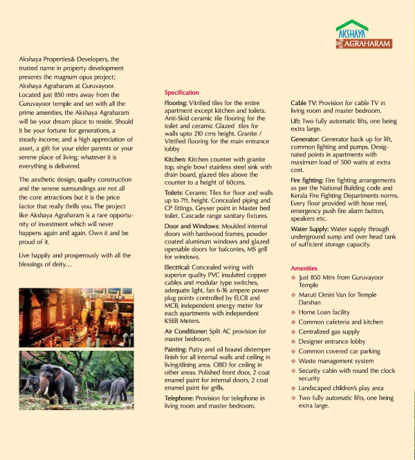 Akshaya Agraharam has studio, 1 & 2 BHK apartments in the temple city of Guruvayur, the abode of Lord Guruvayoorappan.